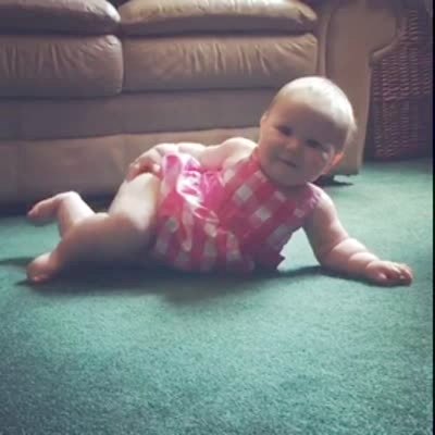 A baby girl crawls on the floor in the living room indoors and positions herself on her side in a way that models do. She loses balance and falls over. Vine/Instagram