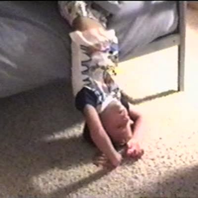 Boy is sleeping upside down with only half of his body on the bed. Sleeps in a funny position. Good visual. Dad wakes him up.