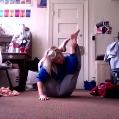 A teen girl sits on the bedroom floor and puts her feet behind her head and then crawls around the room and then falls forward on her face.
