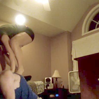 A teen girl tries to do the scorpion yoga position in a dark room by pulling her leg behind her back and over her head. She falls down to the floor off camera.