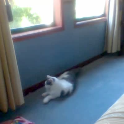A cat sleeps on a window sill. It falls down and lands in the same position that it was in on the sill.
