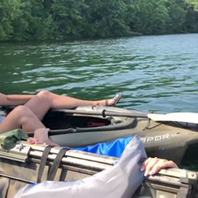 A senior woman struggles to climb into a boat from the water as her family looks on and laughs. Eventually, an adult man helps pull the senior into the boat in an awkward position.
