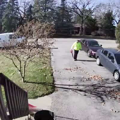 A man blows leaves then a gust of wind blows them all back to their original position in the driveway. Security footage.