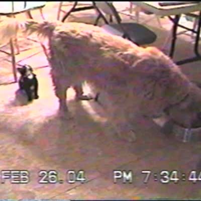 Cat kneads golden retrievers dog's chest. Look like he is hypnotizing him. Animal love.