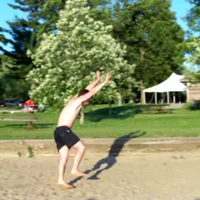 Man jumps on large trampoline falls through the springs when he tries to do a backflip.