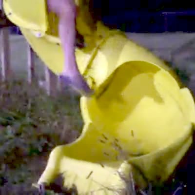 Woman breaks a kiddie tube slide when she get stuck inside midway through. Her legs breaks open the side of the slide. Playground. Bonehead.