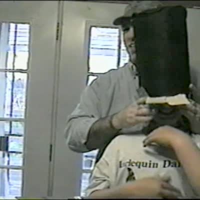 Boy has tall black homemade hat on his head for an Abraham Lincoln costume, the cylinder is stuck over his face. Dad tries to lift it off, boy yells. Hat finally comes off. Long for edit.