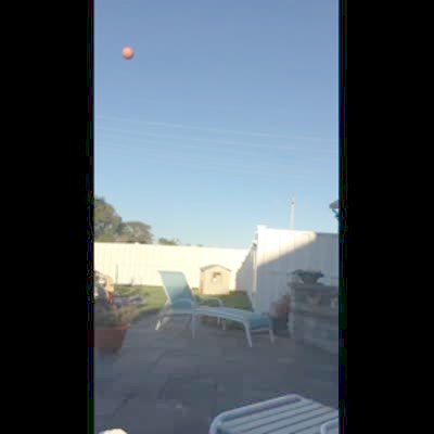 A man throws a basketball across the yard into a Fisher Price hoop. AA: Basketball Trick Shots