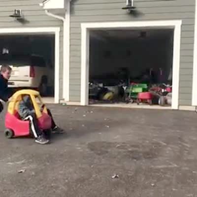 A young boy sits in a fisher price car while a young boy pushes him down the driveway and a hill. The car crashes into a tree and the boy falls.