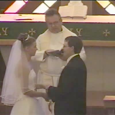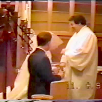 Priest gives groom communion host & wine at wedding. Groom keeps drinking the wine