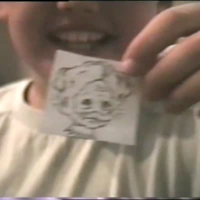 Boy with a picture of an ugly old lady that turns into a pretty princess when turned upside down.