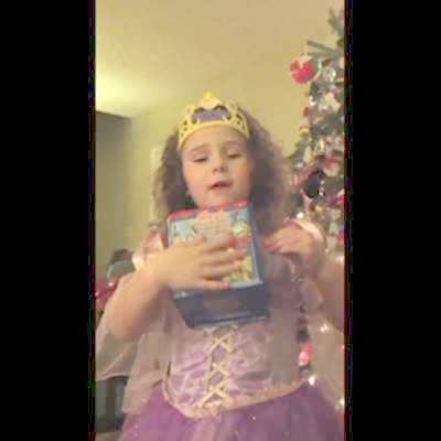 A young girl dressed like a princess gets hit in the nose when a Santa doll pops out of her jack in the box.