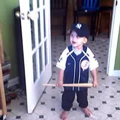 A little boy in a baseball player costume thinks that he is dressed up as a princess.