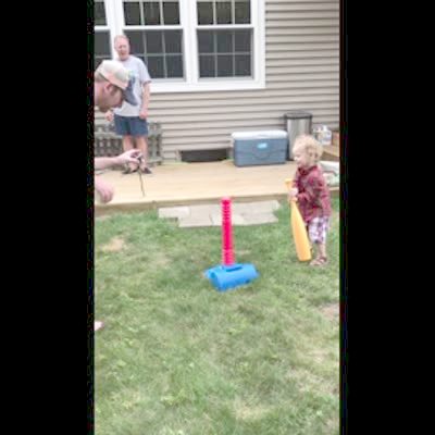 A tot boy hits a ball off a tee that hits his grandfather in the groin. The boy's father laughs while the senior man lays down on the porch.