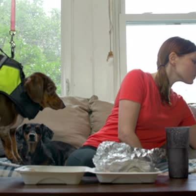 A woman turns her back as she eats fries and a burger next to a black dachshund dog and a brown dachshund dog is lowered into frame with a harness to steal one of her french fries, then pulled away before the woman turns back. Mission Impossible theme music plays over the video. Production video.