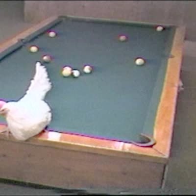 Chicken Pool. Chicken lays egg on pool table, it hits other balls, they all go in.