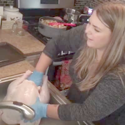 "Thanksgagging Dinner" A woman keeps gagging as she prepares a turkey to cook. Kitchen