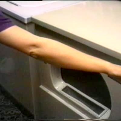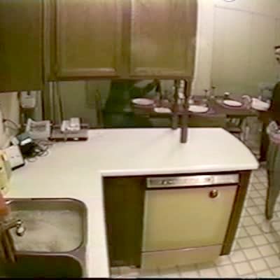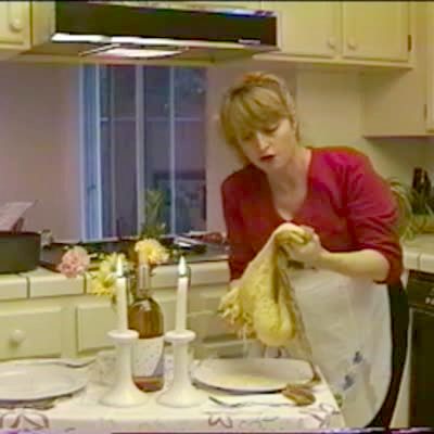 Panty Strainer. Woman demos how to use panty hose as a spaghetti colander.