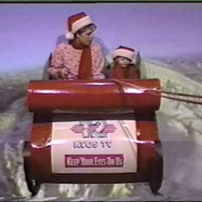 X-mas. Santa in sleigh keyed over city flying, toddler walks away.