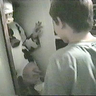 Family members need milk for cereal and coffee, so they open refrigerator, and mom (in cow costume) is in there, and dispenses milk from udders.
