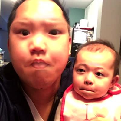 A man holds his baby girl in his lap indoors and uses the face swap app to switch faces with his baby.