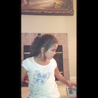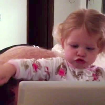 A man films a closeup of a tot girl in the hallway and asks her if she had used any of his hair products. The tot girl responds and the man pulls the camera back to reveal that the tot girl has a long strand of hair that sticks straight up in the center of her head.