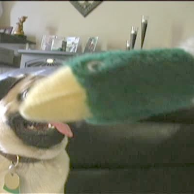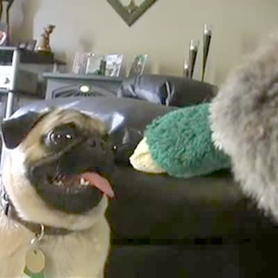 "Dog & Puppet Show" Stuffed duck teases pug dog. Dog stares blankly at duck face then slowly bites it at the end.