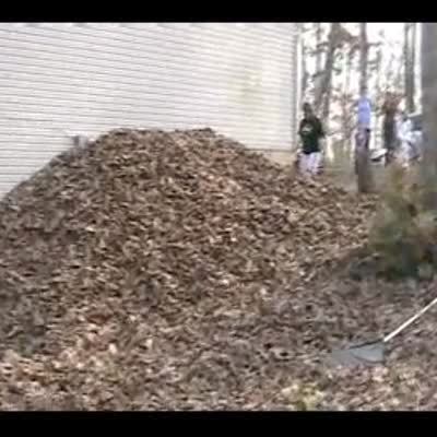 Car emerges from a large leaf pile and drives into the backyard. Leaves, autumn.