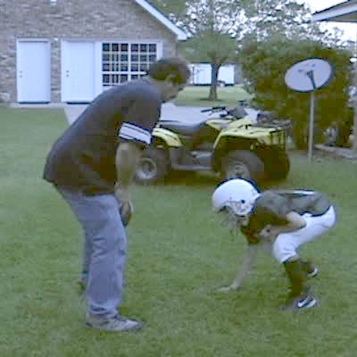 Father & son play football in the yard. Boy hits dad in the groin / crotch - head butts him with his helmet. SET UP.