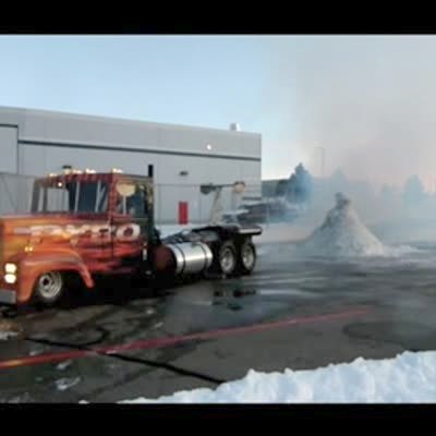 A group of people build a snowman and burn it with a fire throwing truck. Action at 1:07.