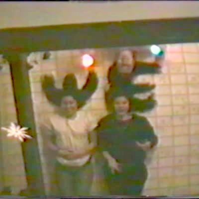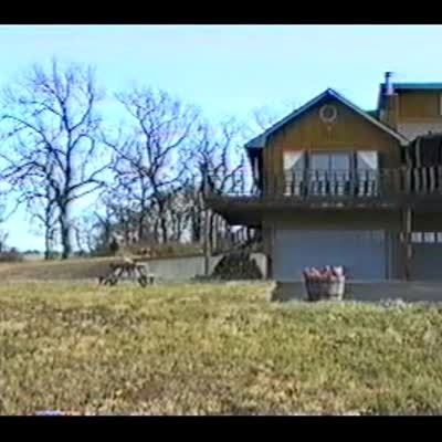 Man holds a walkie talkie & explains how the person on the balcony of the house is going to set off a rocket. Then the rocket comes flying towards man & the camera, barely missing them.