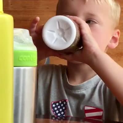 A tot boy spills his chocolate milk all over his face and shirt in a restaurant, and a milk bubble blows out of his nose.