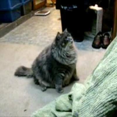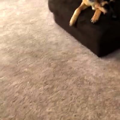 A man tells his German Shepherd dog that she looks like she is up to something, and then the dog sits up and there is a tub with a stick of butter under her chest.