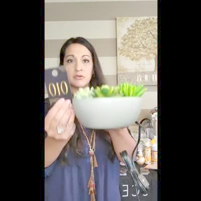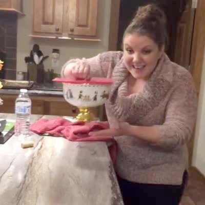 A woman demonstrates how a silicone lid attaches to a ceramic bowl in the kitchen, and when she shakes the bowl it falls and shatters on the counter.