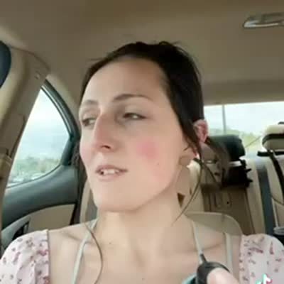 A young woman sprays herself with a fake freckle makeup product in a car, and it comes out as a thick gray spray paint over her eyes. She opens her eyes and gasps.