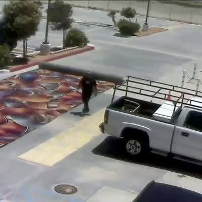 A man rolls out a large carpet in a parking lot and stands on it. A strong wind blows the carpet up and the man falls off. Security camera with no audio