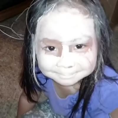 A man films makeup products on the floor at home, then he pans the camera to his tot daughter whose face is covered in it except around her eyes.