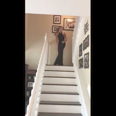 Teen girl walks down the stairs in a prom dress, gets half way down and trips. Falls the rest of the way, then gets up and smiles, thankful that she had pants on.