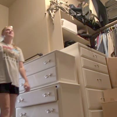 A teen girl walks into a closet and is scared of a witch halloween prop.