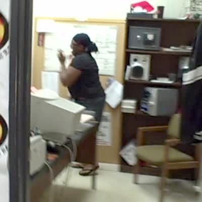 woman poses near a coffin in an office. Man jumps out & scares her. She screams & runs out.