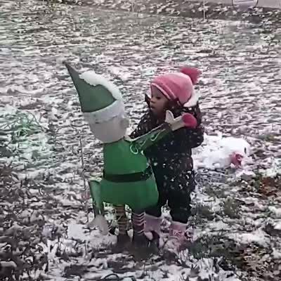 A tot girl shakes the hand of an elf prop in the front yard, and its head falls off. She runs away looking surprised.