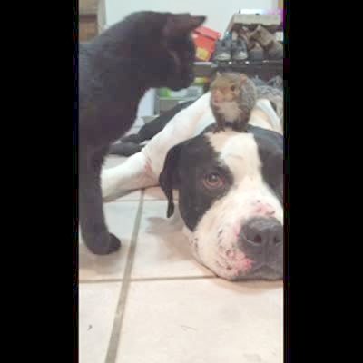 A squirrel sits on a dog's head as the dog lays on the floor. A black cat walks up and tries to paw at the squirrel and the dog growls at the cat to protect the squirrel indoors.