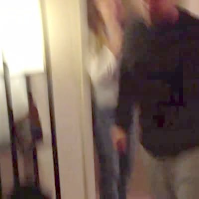 A young man runs in a living room and drop kicks another man in the chest who wears military body armor and a helmet. The man who got kicked falls down to the floor, hard. Several other men and women watch. Short tails.