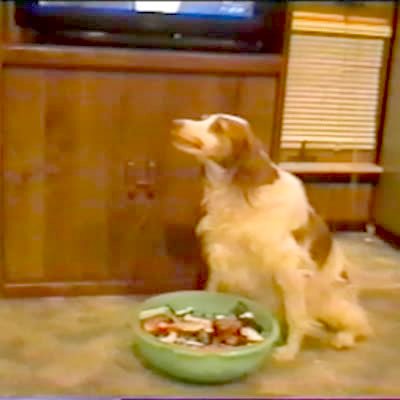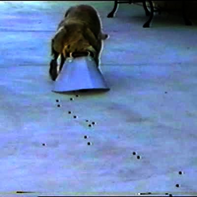 Dog with protective collar on doubles as a vacuum... he looks like he's sucking up food as he goes by & eats