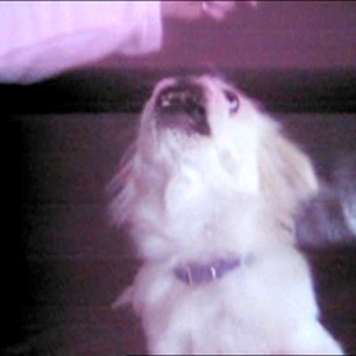 Little white dog barks a lot when someone tries to take its toy fish. Shot off TV.