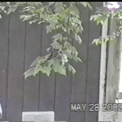 A rooster bird bites at a young girl's ankles, then it chases her around a yard until a dog tackles the rooster. No sound. Security camera footage. Multiple angles.