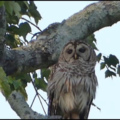 An owl sits on a tree branch as birds attack, protecting their nest.