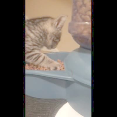 Cat eating food has a purple protective cone around its head. Cat gets metal food can stuck on its head and in the cone. Man takes it off.
