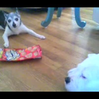 A small dog growls while protecting a bag of Nutter Butters. A large dog grabs them when it's not looking.
