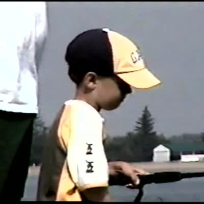 Young boy tries to cast fishing pole next to dad. Dad puts his hands up to protect himself & accidentally pushes boy into the water.